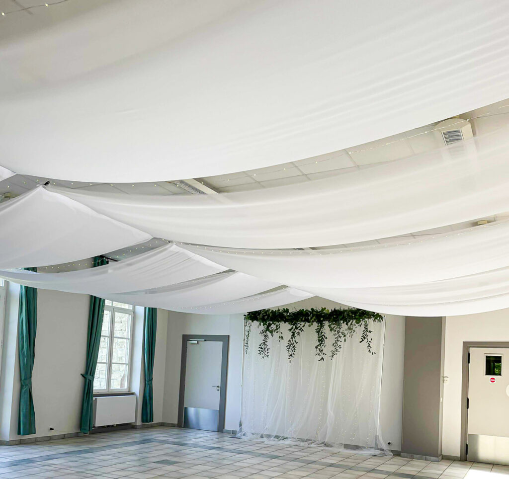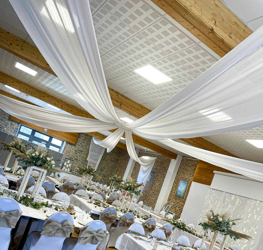 Apportez une touche d’élégance et de douceur à votre événement grâce à nos drapés et voiles décoratifs, adaptés à tous types de salles et d’ambiances.